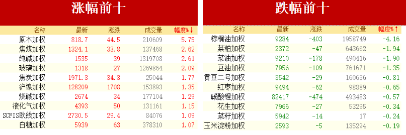 午盘收盘,国内期货主力合约涨多跌少,原木涨停,涨幅5.99%,焦煤、纯碱涨近3%,玻璃涨2%,焦炭、液化石油气(LPG)、烧碱涨近2%。跌幅方面,棕榈油跌超近4%,菜粕跌超2%。