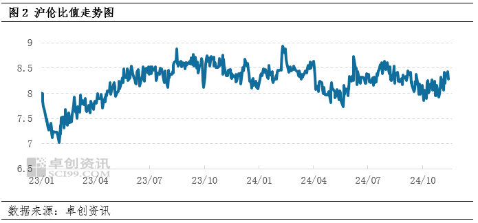 尽管年内经历了较长时间的锌精矿供应紧张情况,但近期锌精矿供应有增加预期,原料紧张情况或能够得到缓解。首先,近期CZSPT发布了2025Q1锌矿TC指导价,较当前TC上调,显示出锌矿紧张有缓解预期。其次,海外部分锌矿山近期陆续复产,Buenavista、Kipushi和Aripuan等矿山有投爬产情况,海外锌矿供应增加。最后,沪伦比值自10月开始进入上涨通道,目前接近近两年高位水平,进口盈利窗口打开,锌精矿进口流入增加,一定程度上弥补了国内锌精矿的供应缺口。