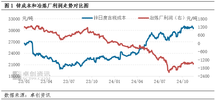 2024年以来,锌精矿供应紧张情况不断发酵,国内外矿山受矿石品位下滑、极端天气、意外情况、设备技术问题和停产项目未恢复等多重因素影响,矿山整体产出出现下滑。因此,锌精矿加工费下滑,锌精矿价格上涨,冶炼厂成本上涨,与此同时,冶炼厂利润被压缩。根据卓创资讯监测,截至2024年11月份,主流冶炼厂炼锌利润在亏损1500元/吨附近,8月份亏损一度达到2000元/吨以上。因此,冶炼厂整体开工积极性下滑,8月下旬更是宣布了联合减产计划,锌产出同时受影响下滑,价格得到上涨支撑,逐渐上行达到年内高位。