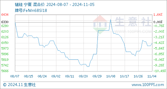 11月5日,生意社锰硅基准价为6050.00元/吨,与本月初(6070.00元/吨)相比,下降了-0.33%。