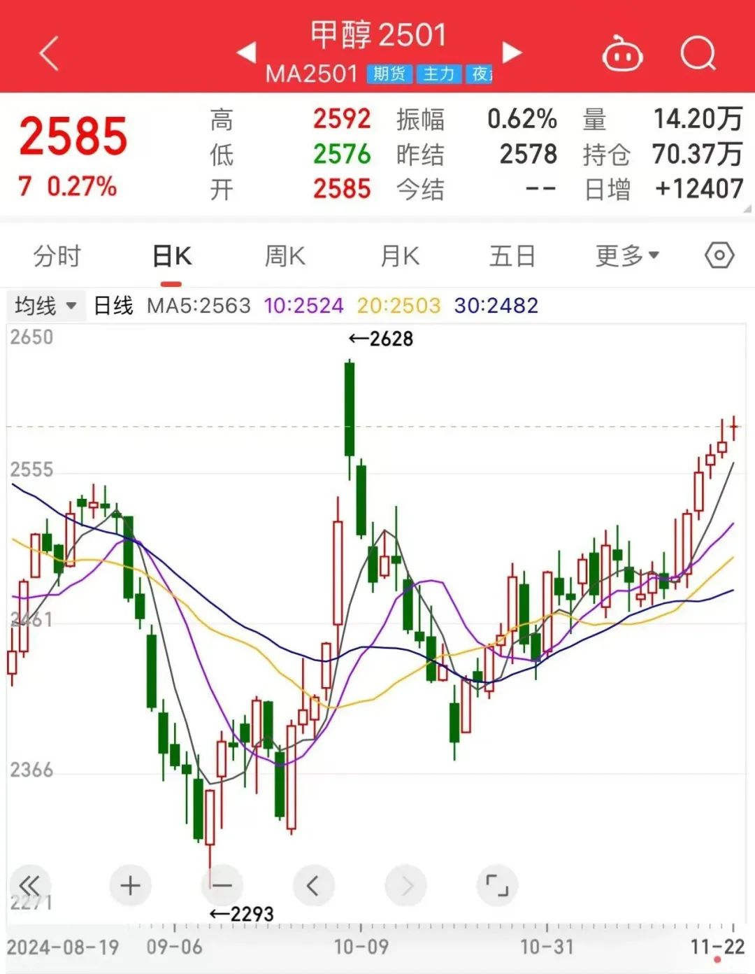 值得注意的是,近期甲醇期货持仓量明显增加。以MA2501合约为例,前期持仓量一度降至57万手左右,近期已增至65万手左右。