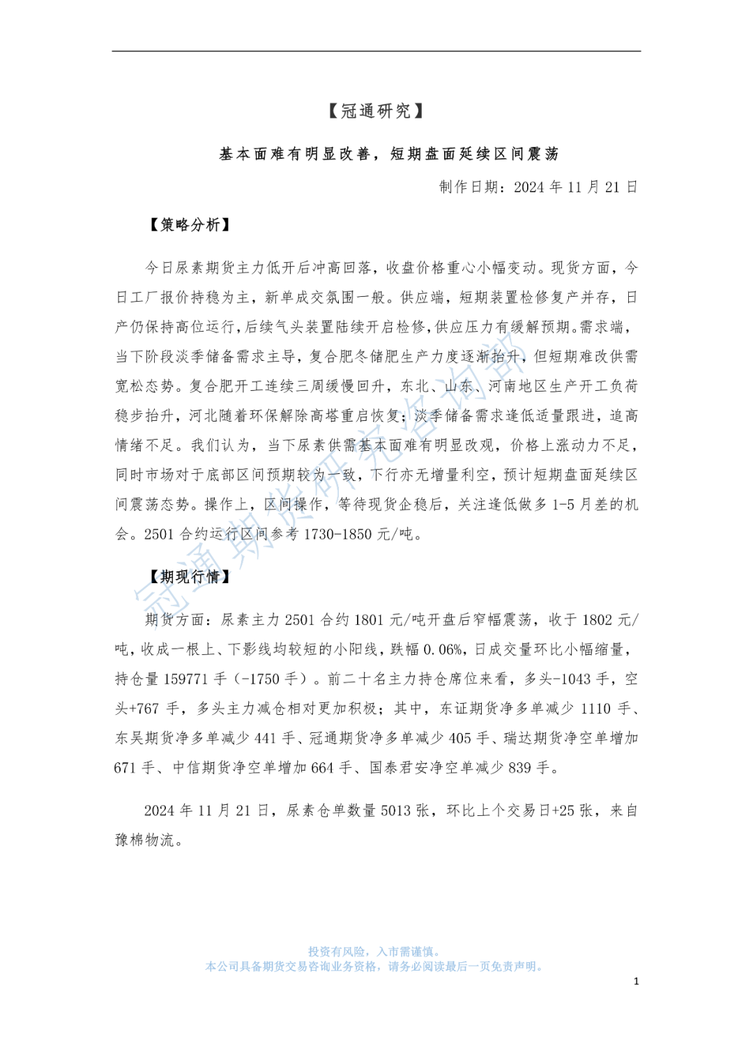 冠通研究--尿素策略:基本面难有明显改善,短期盘面延续区间震荡