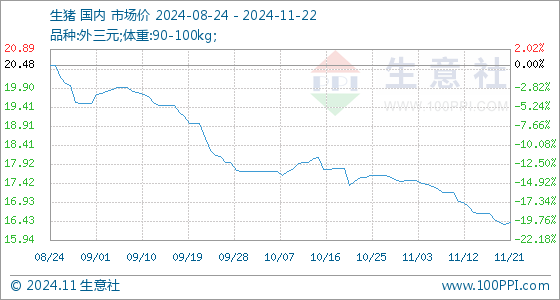 11月22日,生意社生猪基准价为16.40元/公斤,与本月初(17.47元/公斤)相比,下降了-6.12%。