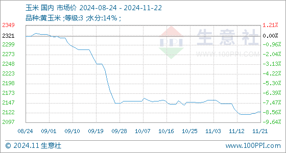 11月22日,生意社玉米基准价为2124.29元/吨,与本月初(2151.43元/吨)相比,下降了-1.26%。