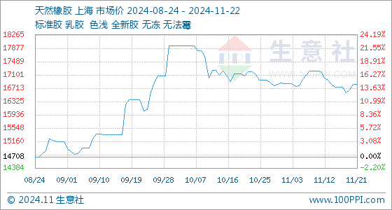 11月22日生意社天然橡胶基准价为16823.00元/吨
