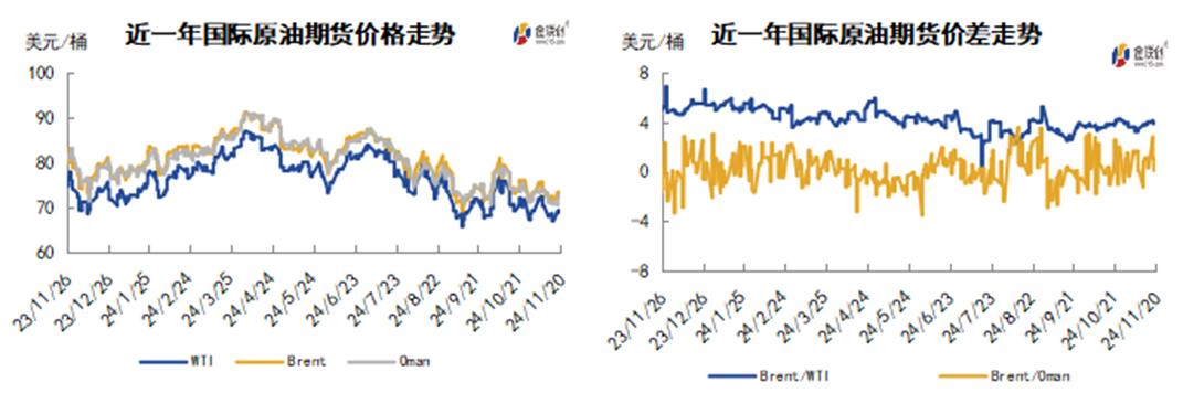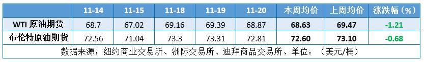 本周(11.14-11.20),原油整体呈现区间震荡的走势,均价环比下跌。