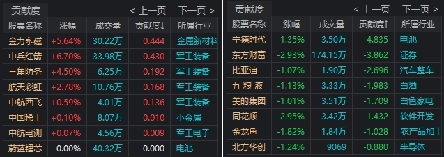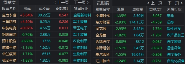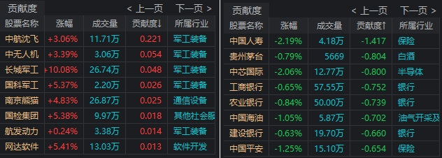另据同花顺统计,11:26~13:20,即大盘首个连续跳水段,三大指数中“上涨/下跌贡献度”居前的个股如下。