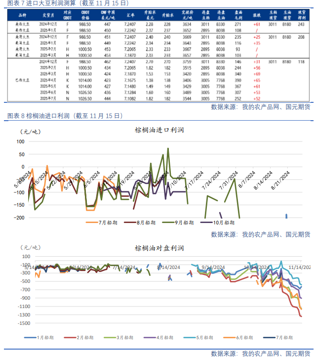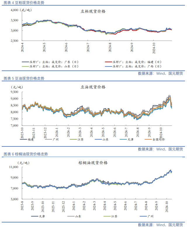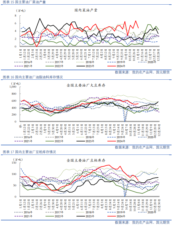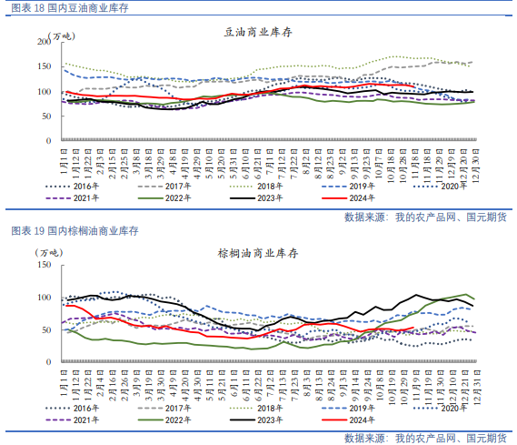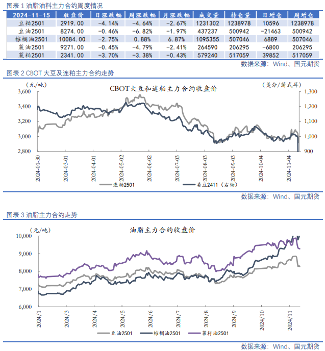 大选后市场对美国生物柴油政策或有所调整限制美豆长期需求,美豆由此连跌4个交易日,国内豆粕跟跌重回3000关口之下。产地来看,美豆丰产基本落地,南美大豆种植进度基本追平。国内豆粕市场上,四季度后期随着美豆集中上市,国内进口大豆及豆粕预计将回归宽松格局,随着进入冬季猪肉腌腊高峰,出栏压力释放前豆粕需求存在提振,预计豆粕短期仍将反复争夺3000关口。菜系短期缺乏独立驱动,以跟随豆粕运行为主,不过国内菜粕库存偏高而需求疲软现状下,缺乏反弹驱动,后市仍需持续跟踪中加贸易摩擦的情况。