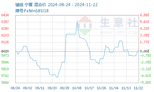 本周硅锰市场在平稳态势中继续回暖运行。锰硅市场活跃度较高,钢厂陆续招标,工厂低价出货意愿不高,买卖双方持续博弈,在政策预期向好的情况下,市场心态较坚挺。根据生意社商品行情分析系统的数据显示,本周末硅锰在宁夏地区(规格为FeMN68Si18)的市场报价6000-6100元/吨左右,市场均价6044.00元/吨,较周初稍上涨1.24%。