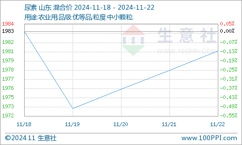 据生意社商品行情分析系统,截止11月22日,国内尿素市场参考均价为1981元/吨,较11月18日参考均价1983元/吨,国内尿素市场价格下跌幅度为0.13%。