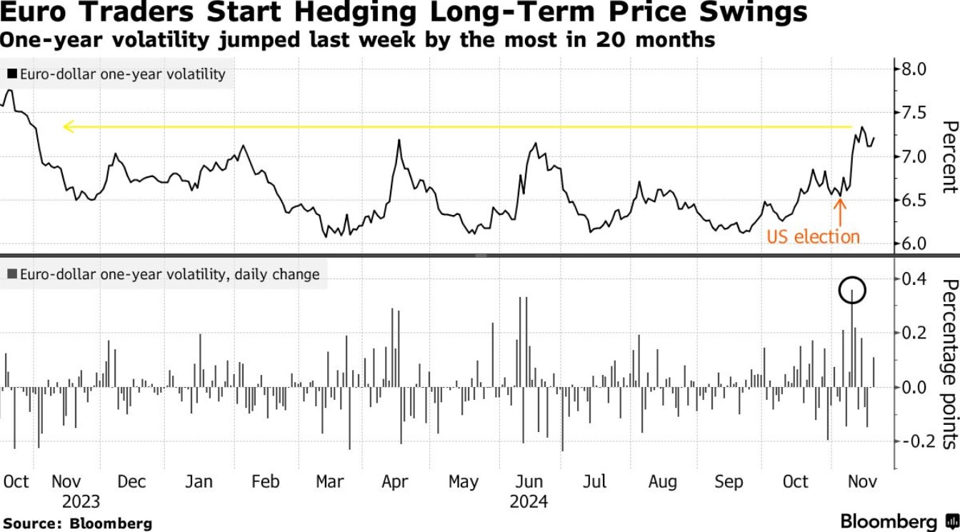 经过多年以来的相对温和波动之后,欧元兑美元汇率的“一年期波动率指标”在特朗普宣布赢得选举后大幅飙升,上周直接创下近2年来的最高水平。为应对特朗普正式重返白宫后可能带来的更加剧烈波动,对冲基金们正在大举买入期权合约,如果美元兑这些货币的汇率波动加剧,这些合约将获得巨额收益,策略师们也大幅修改了他们的汇率预测。