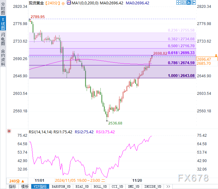 汇通财经APP讯——现货黄金价格在连续五天上涨后,于周五(11月22日)欧洲时段触及近两周高点,交投于2697.33美元/盎司,日内涨幅1.04%。尽管美元走强及美国国债收益率高企,但黄金价格依然表现坚挺,显示出避险需求的强势。