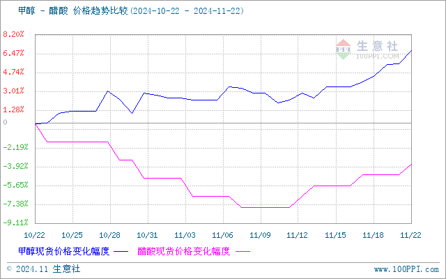 生意社甲醇-醋酸(下游产品)价格走势比较图: