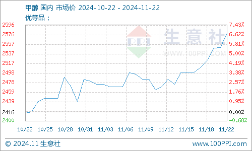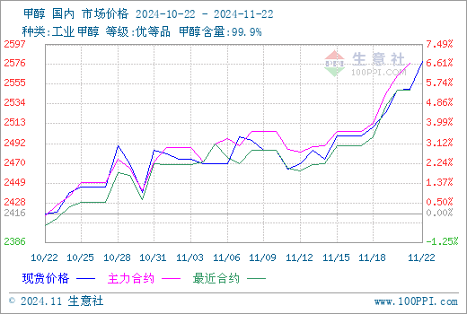 据生意社商品行情分析系统,11月18日至22日(截止15:00),国内甲醇市场华东港口均价自2510元/吨上涨至2580元/吨,周期内价格涨幅2.79%,环比上涨6.76%,同比上涨7.43%。国内甲醇市场上涨为主。下游部分大型烯烃装置持续外采,加之甲醇企业库存低位,部分生产企业限量出货,推动内地甲醇市场价格持续上涨。