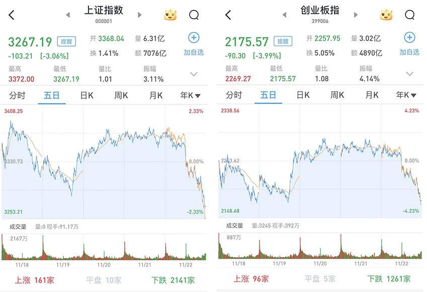 A股三大股指11月22日延续了集体低开模式。早盘两市震荡下行,午前的急跌导致跌幅扩大。午后跌幅再度扩大,沪深股指均跌超3%,创指更是一度跌超4%。