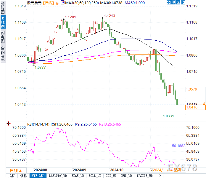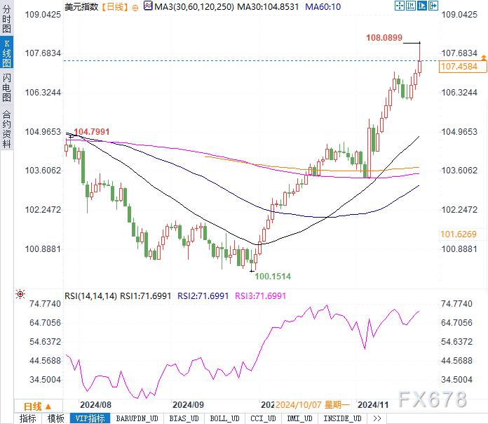 当前美元指数报107.4434,日内上涨0.36%,接近2023年10月以来高位。本周贵金属市场强势反弹,现货黄金上涨1.38%至2705.62美元/盎司,为本月最佳周表现。油市则在俄乌紧张局势升级的背景下实现5%的周涨幅,其中布伦特原油报74.36美元/桶,美原油报70.17美元/桶。外汇市场方面,欧元兑美元跌至1.0428,日元兑美元微跌至154.365,反映出欧洲经济前景低迷及日元避险需求。债市也呈现波动,欧洲主权债收益率下降,市场对下月主要央行决议的预期正在重新校准。