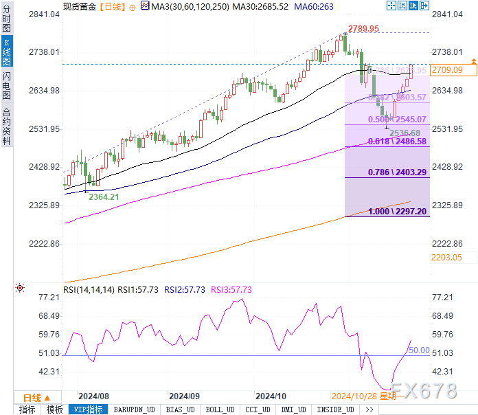 现货黄金本周表现强劲,日内涨幅达1.38%,交投于2705.62美元/盎司,累计周涨幅超过5%,创下去年10月以来的最佳单周表现。本周金价受益于多个因素的叠加,包括俄乌局势升级、美元走强,以及对美联储政策前景的不确定性。