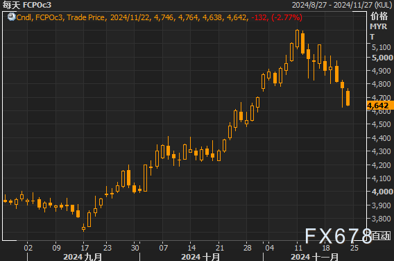 汇通财经APP讯——周五(11月22日),棕榈油期货市场迎来了一周以来最大的跌幅,市场情绪低迷,价格受多个因素拖累,尤其是需求前景的不确定性和大豆油价格的疲软。今日马来西亚棕榈油期货价格下跌132林吉特,收于每吨4640林吉特(约合1039.19美元),较上周五的价格下降了8.81%。这是自2023年4月以来,棕榈油市场最为显著的一次周度跌幅。本文将从基本面和技术面两个角度分析当前棕榈油期货的市场走势,并展望未来趋势。