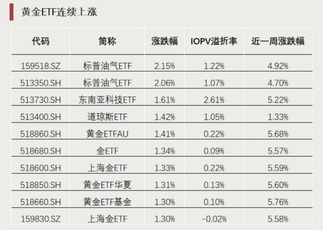 11月22日,油气、黄金等主题ETF领涨,标普油气ETF(159518)、标普油气ETF(513350)涨超2%,黄金ETFAU(518860)、金ETF(518680)、上海金ETF(518600)等涨超1.3%。