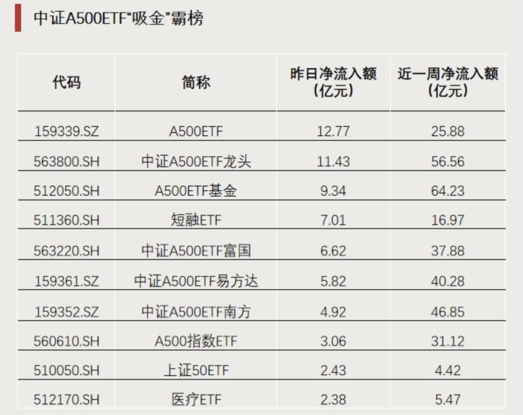 昨日净流入金额整体有所放缓,中证A500ETF依然为“吸金”主力品种。在昨日净流入额最多的前十名非货ETF中,中证A500ETF占据七席。近一周净流入额最多的前十只ETF全部为中证A500ETF,前三名分别来自华夏基金、广发基金、南方基金。