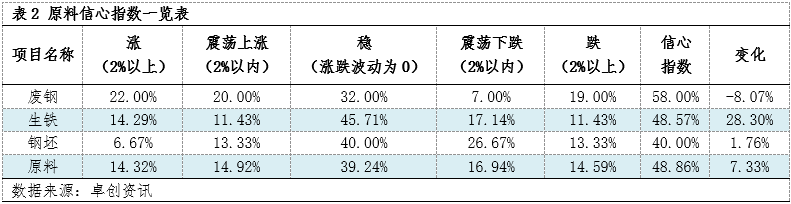 分品种来看,废钢信心指数为58,较上期降8.07;生铁信心指数为48.57,较上期增28.30;钢坯信心指数为40,较上期增1.76。