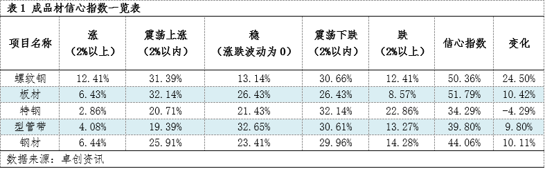 分品种来看,螺纹钢信心指数为50.36,较上期指数增24.50;板材信心指数为51.79,较上期指数增10.42;特钢信心指数为34.29,较上期指数降4.29;型管带信心指数为39.80,较上期增9.80。