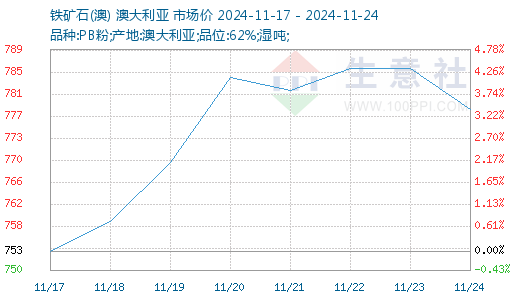 据生意社商品行情分析系统显示,本周(11.17-11.24,下同)铁矿价格窄幅震荡运行。截至24日,生意社铁矿价格指数为779,环比上行.36%,具体如上图。本周铁矿行情呈现先涨后跌,趋强震荡趋势,其主要原因子啊与大环境向好,市场队正常导向存有预期,投机情绪活跃,投机交易增加,影响期货市场行情波动;钢厂谨慎观望居多,铁矿采购操作以按需补库为主;铁矿供需双增,所以本周铁矿价格先涨后跌,偏强运行。