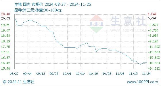 11月25日,生意社生猪基准价为16.50元/公斤,与本月初(17.47元/公斤)相比,下降了-5.55%。