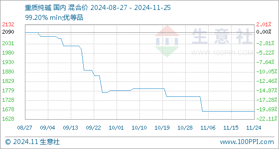 11月25日,生意社重质纯碱基准价为1670.00元/吨,与本月初(1750.00元/吨)相比,下降了-4.57%。