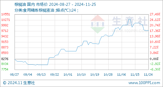 11月25日生意社棕榈油基准价为9740.00元/吨