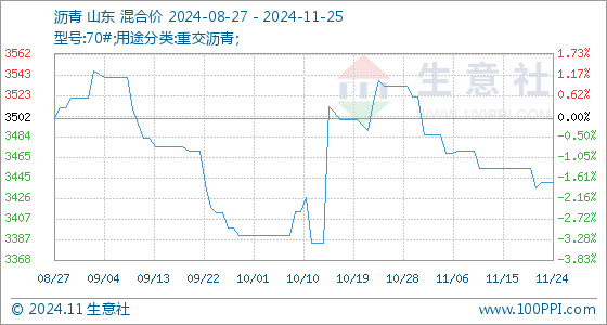 11月25日,生意社沥青基准价为3441.00元/吨,与本月初(3522.67元/吨)相比,下降了-2.32%。