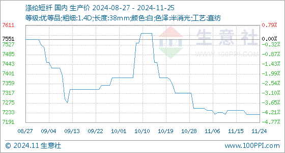 11月25日,生意社涤纶短纤基准价为7226.67元/吨,与本月初(7251.67元/吨)相比,下降了-0.34%。