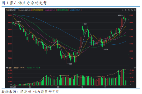 本周内聚乙烯主力合约盘面价格周二(11/19日)、周三(11/20日)连续两天冲击高位,持仓达近期最高水平,主要由于基本面供应端偏紧叠加市场整体情绪推动导致 L2501合约价格持续上行。截至周五(11/22日)收盘价为8471元/吨,虽对比前期出现一定程度回落,但对比前期依旧偏强运行。