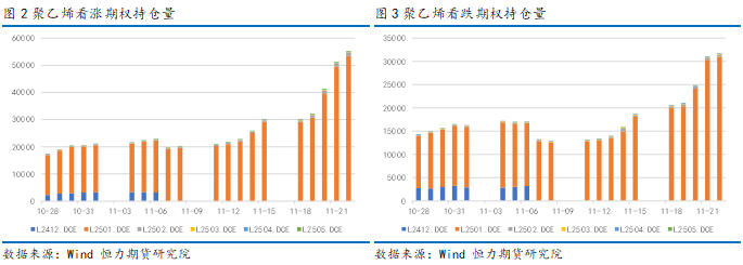 从看涨、看跌期权持仓情况分析,当前持仓量主要集中在当前主力合约L2501合约上。截至11/22日星期五收盘数据来看,看涨期权端持仓总量远大于看跌期权端持仓总量,当前看涨期权持仓总量为5.5万手,其中以L2501合约为标的看涨期权持仓量约为5.3万手;看跌期权持仓总量为3.2万手,其中以L2501合约为标的看跌期权持仓量约为3.1万手,主力合约近期看涨情绪相对强烈。对比当前主力合约期权不同行权价的持仓量分布图来看,当前L2501合约看涨期权持仓量分布较为分散。看涨主要集中在平值附近的8300、8400、8500以及相对虚值的8600、9000等几个行权价档位上,8600点可看作当前聚乙烯主力合约价格第一压力位。尤其是深度虚值的行权价为9000的看涨期权,当前持仓超过1.06万手;而看跌期权的持仓量主要集中在浅虚值的8000、8100等几个行权价档位上,当前看跌期权持仓量均超过5000手。