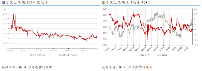 从短期来看,我们认为当前聚乙烯基本面利好支撑幅度有限,且主力合约也将慢慢切换至L05,短期行情将告一段落,整体依旧维持偏空观点。对于聚乙烯这类常年维持低波动水平的品种,当前波动率水平还有进一步下降空间。建议应以卖出期权思路为主,可短线介入L2501合约的适当行权价档位的卖出看涨期权策略以获取波动率回落及时间价值衰退的收益。