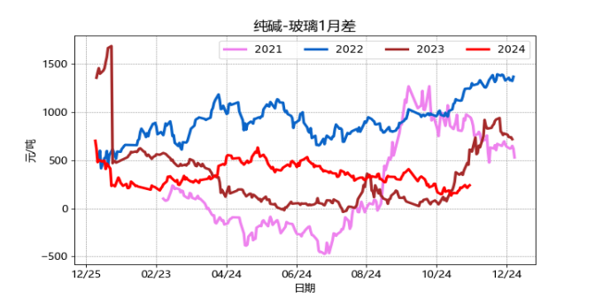 11月22日,纯碱-玻璃1月差为241.0。过去五年最大值为1689.0,过去5年最小值为-473.0,过去5年中位数为443.0。过去1年最大值为941.0,过去1年最小值为134.0,过去1年中位数为346.0。2023年同期价差为612.0,2022年同期价差为1245.0。