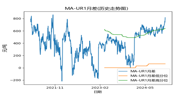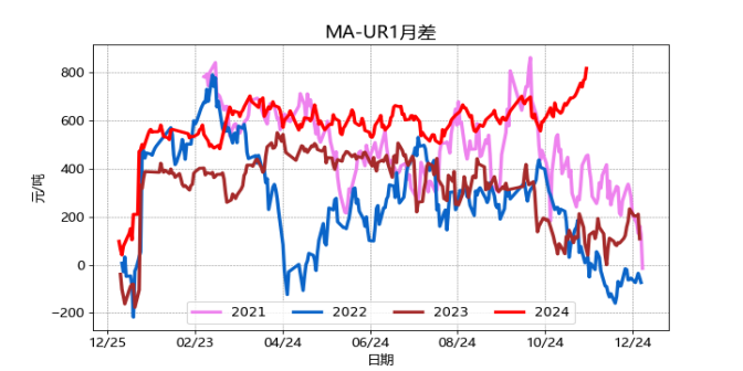 11月22日,MA-UR1月差为818.0。过去五年最大值为863.0,过去5年最小值为-218.0,过去5年中位数为427.0。过去1年最大值为818.0,过去1年最小值为0.0,过去1年中位数为585.0。2023年同期价差为63.0,2022年同期价差为24.0。