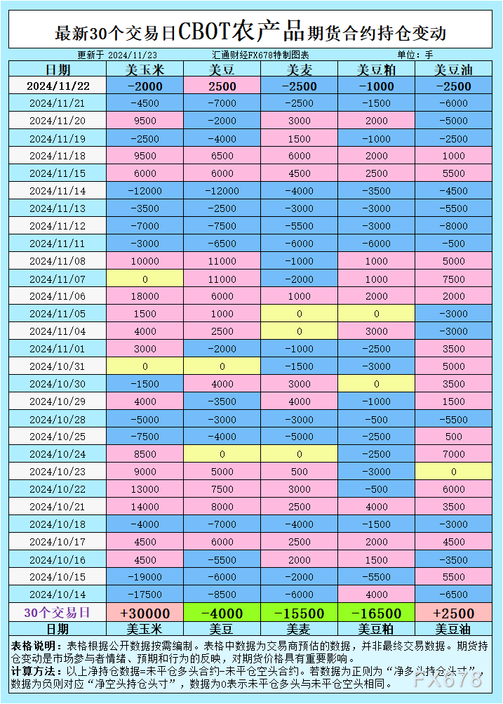 3.基金持仓变化:截至11月22日,大宗商品基金大幅增加了小麦的净空头头寸,但最近五个交易日转为净多头。基金对短期市场走势预期发生波动,或反映出对全球供应与需求前景的不确定性。