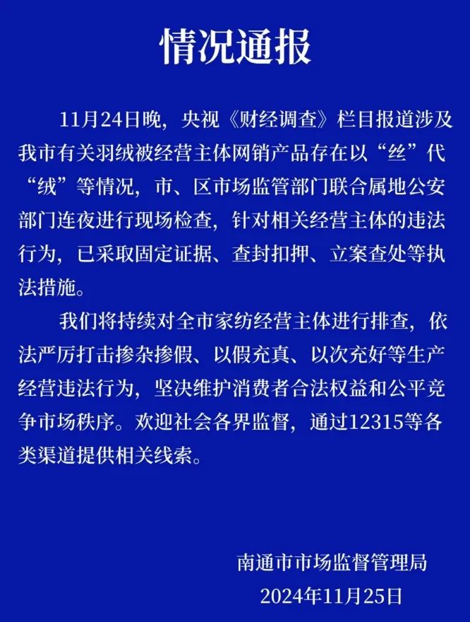 11月25日,江苏省南通市市场监督管理局发布情况通报称,24日晚,央视《财经调查》栏目报道涉及南通市有关羽绒被经营主体网销产品存在以“丝”代“绒”等情况,市、区市场监管部门联合属地公安部门连夜进行现场检查,针对相关经营主体的违法行为,已采取固定证据、查封扣押、立案查处等执法措施。