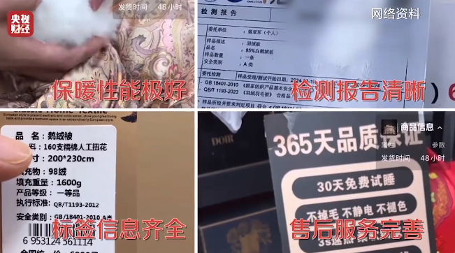 据央视财经调查,直播间内,促销价仅需几百元的羽绒被,被主播们吹得天花乱坠,不仅物美价廉、保暖效果出类拔萃,各种检测报告也十分齐全。实际上,填充物、吊牌标签全造假!