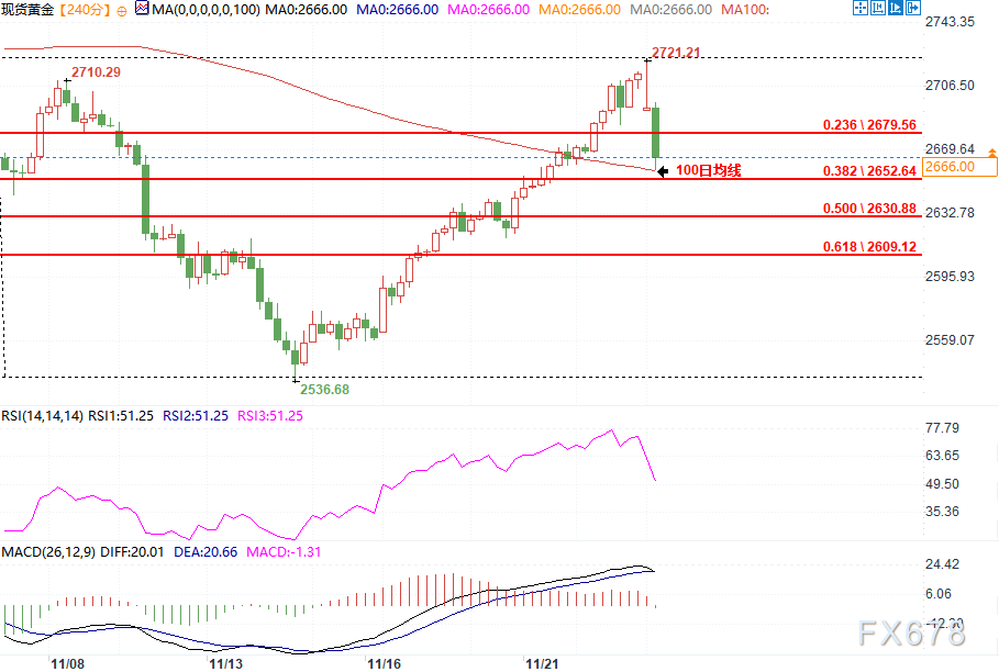 从技术角度看,Menghani认为,金价需跌破2650美元区域才能确立空头主导。日内大幅下跌已将金价拉至,从11月14日两个月低点反弹以来的23.6%斐波那契回撤位下方。然而,金价的后续跌势在100日均线附近暂时止步。