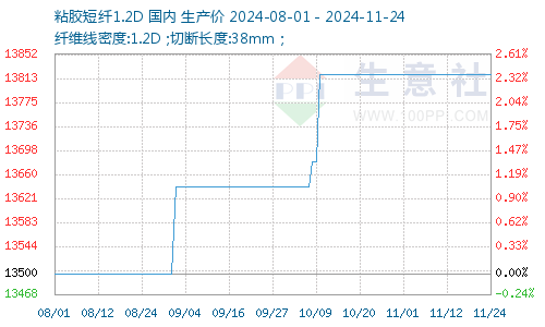 据生意社商品行情分析系统显示,截止11月24日,1.2D*38mm粘胶短纤国内地区出厂报价为13820元/吨,价格延续持稳。