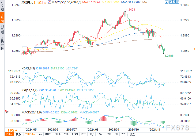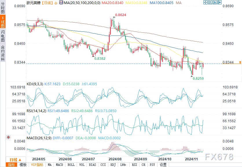 欧元/英镑从上周五低点0.8269反弹,该低点下方是当前11月的低点0.8260,上一次交易是在2022年4月。