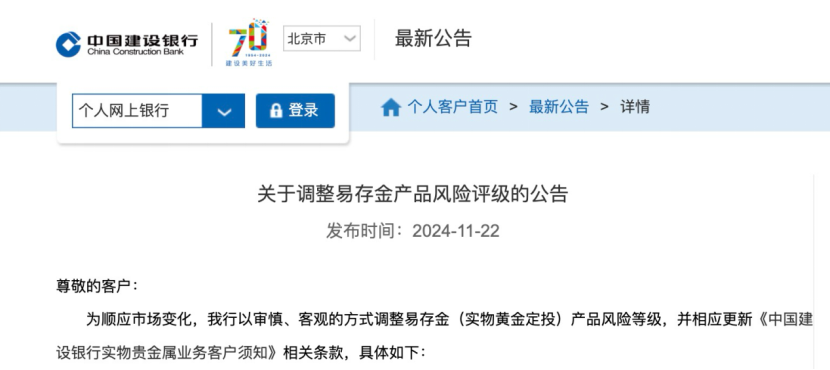其中,11月22日,建设银行公告,将上调易存金(实物黄金定投)产品风险等级为中风险。