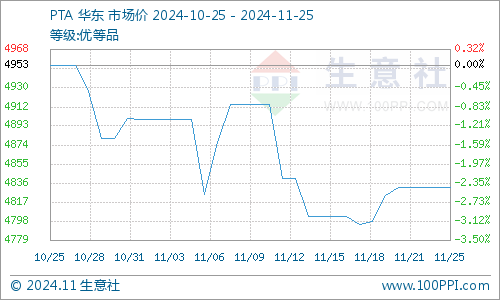 国内PTA市场价格出现止跌企稳,截止11月22日国内华东地区市场均价在4832元/吨,较11月18日上涨0.76%。但PTA开始累库,据统计社会库存在386万吨左右。目前,华东地区300万吨PTA装置其中150万吨、250万吨PTA装置,华南地区450万吨、西北地区120万吨均将陆续重启、提升负荷。当前国内PTA开工率在86%附近,之后会进一步提升,现货市场供应表现充裕。
