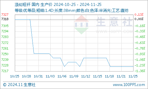 据生意社商品行情分析系统,近期国内涤纶短纤市场行情小幅偏弱调整,截止11月25日江浙主流工厂1.4D*38mm均价在7226元/吨,较11月12日下跌0.23%。