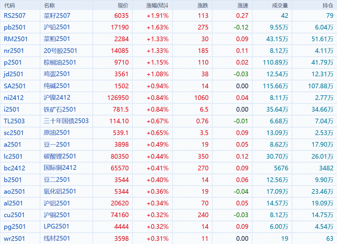 11月25日,午盘收盘,国内期货主力合约有涨有跌。沪铅、菜粕、20号胶(NR)、棕榈油、鸡蛋涨超1%。跌幅方面,集运欧线封跌停板,跌幅16%;焦煤、原木跌超2%。