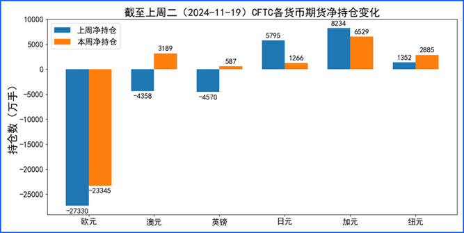 据美国商品期货委员会公布的2024-11-19期货市场头寸持仓报告显示,上周各货币的报告总持仓情况如下:欧元净多头变化3985手,澳元净多头变化7547手,英镑净多头变化5157手,日元净空头变化4529手,加元净空头变化1705手,纽元净多头变化1533手,上周总持仓多空转换的货币有:澳元,英镑。除此之外,单向总持仓变动超过20%的货币有:纽元。