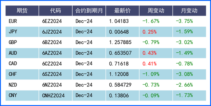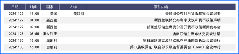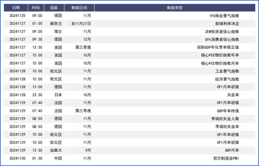 美元指数上周连续第三周走高,再度呈现一枝独秀格局。最新公布的11月综合采购经理人指数升至2022年4月以来最高,与欧洲、英国PMI跌破荣枯线的表现对比鲜明。不过部分美联储官员上周公开发言开始显露进一步宽松预期。同时由于拟议的关税被推迟到2025或2026实施,及美国企业加速在关税生效前进行海外采购的预期,全球经济或将得到喘息,其他货币也或将受此提振。