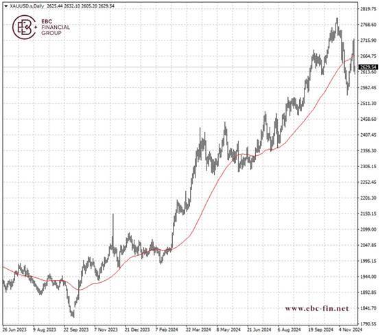 黄金再次跌破50日移动均线,凸出了美国大选后其脆弱性。关键阻力位在2600美元,如果失守会走向11月中旬触及的低位2540附近。